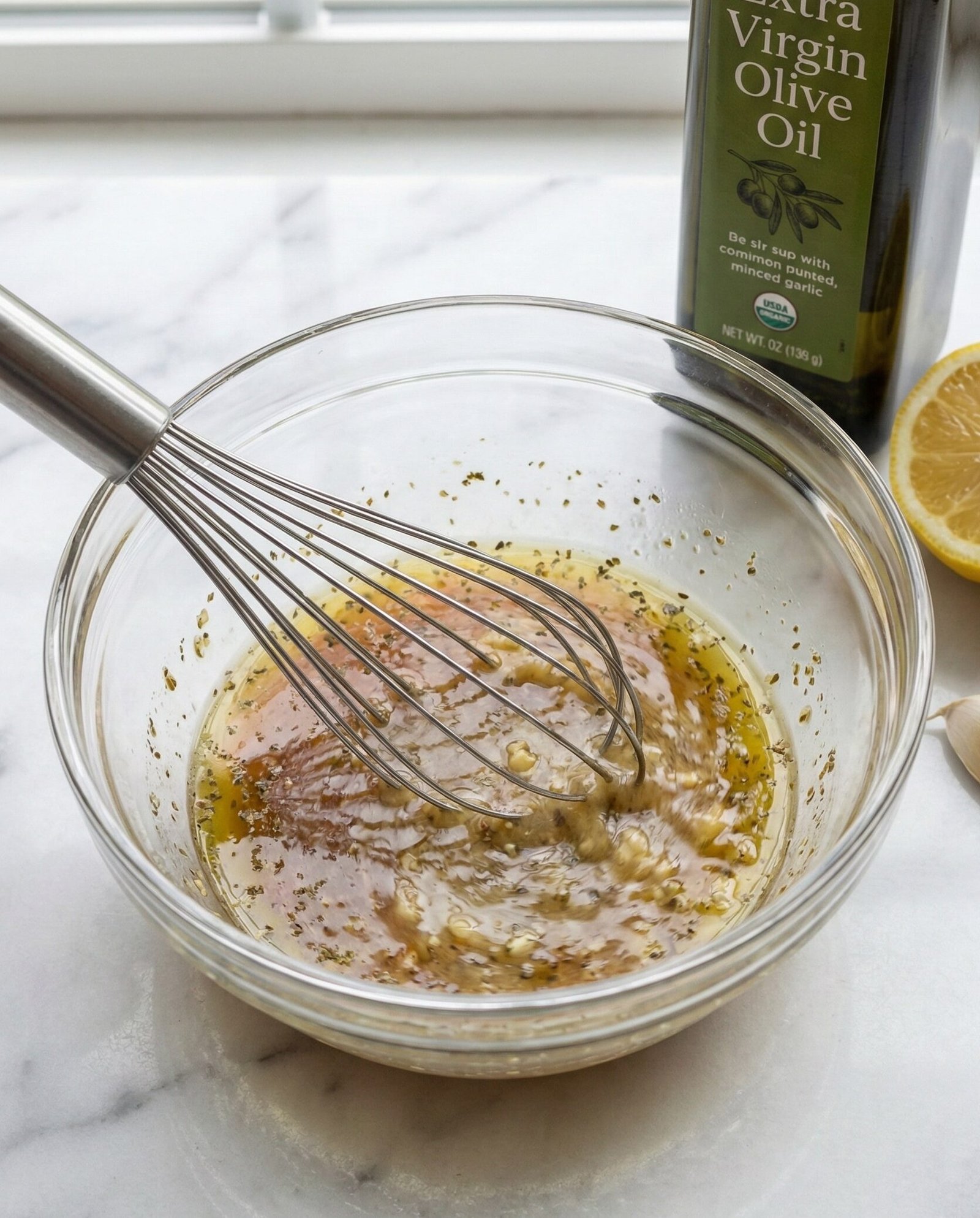 - Whisk together vinegar, lemon juice, mustard, garlic, oregano, salt, and pepper. Slowly whisk in olive oil until emulsified.