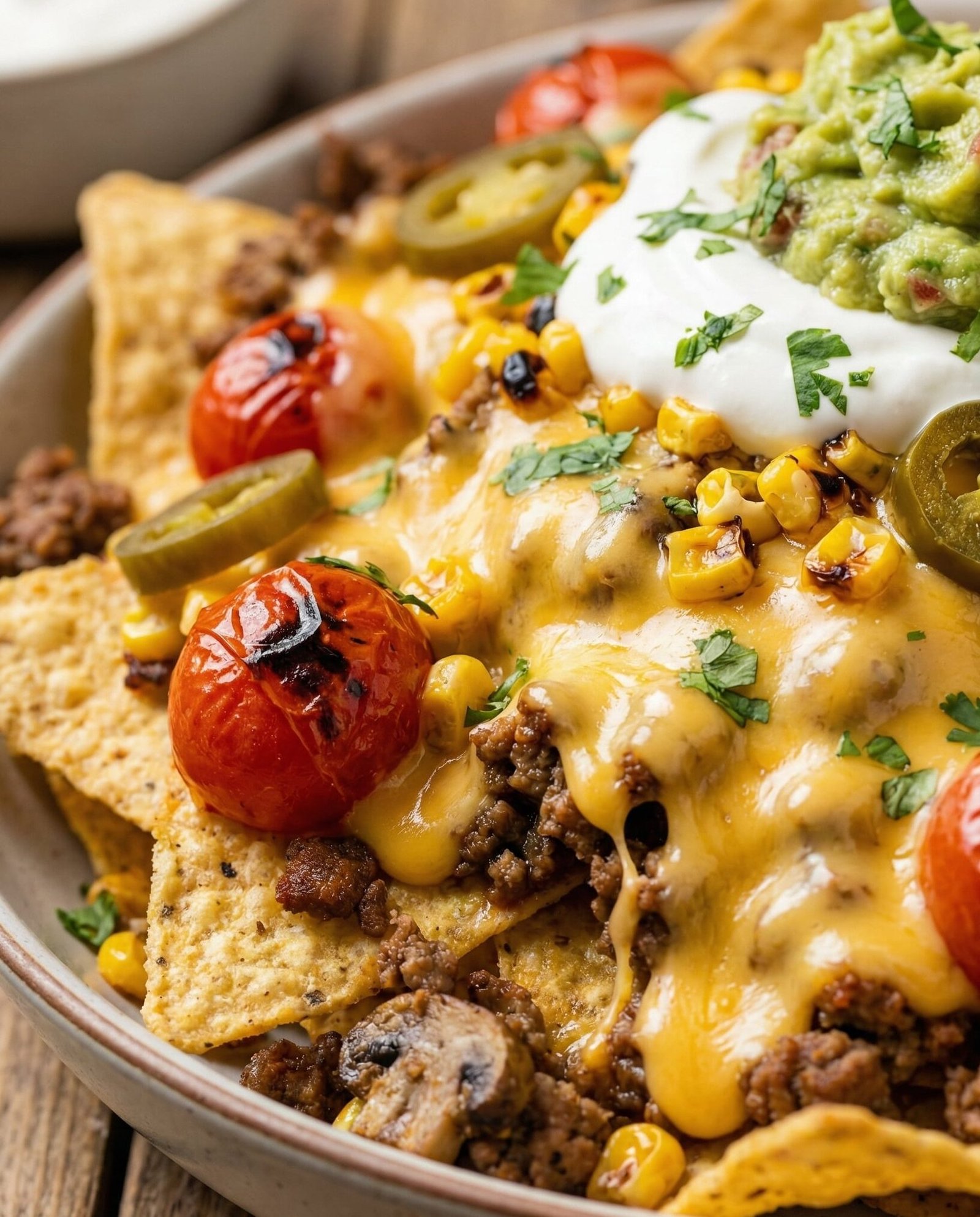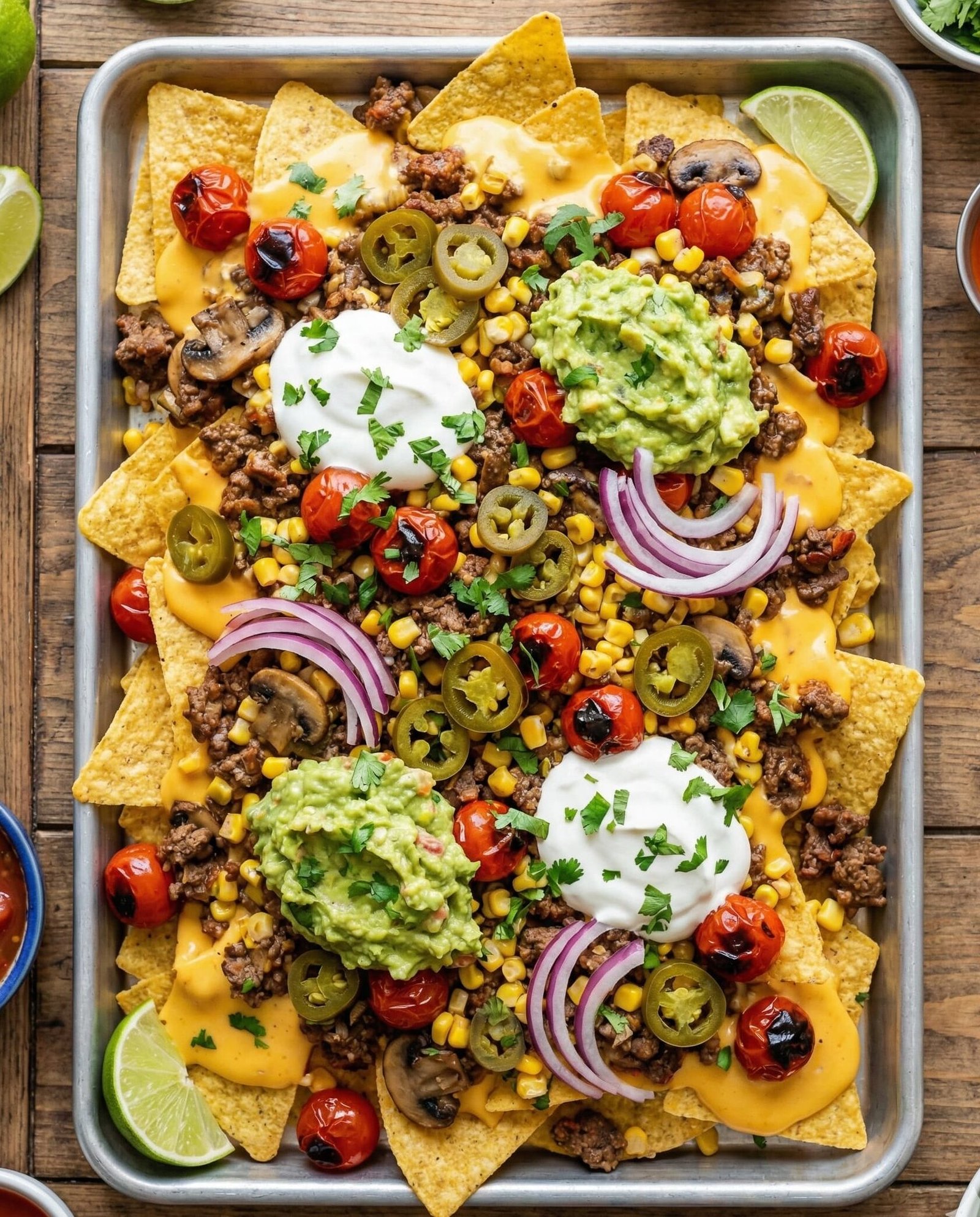 These are not your average sad nachos drowned in neon cheese. We’re talking crispy, golden homemade chips, flavor-packed beef-mushroom topping, creamy nacho cheese sauce, and charred veggies—all stacked like a glorious Tex-Mex lasagna. It’s the kind of dish that makes your friends go “Wait… you made this at home?