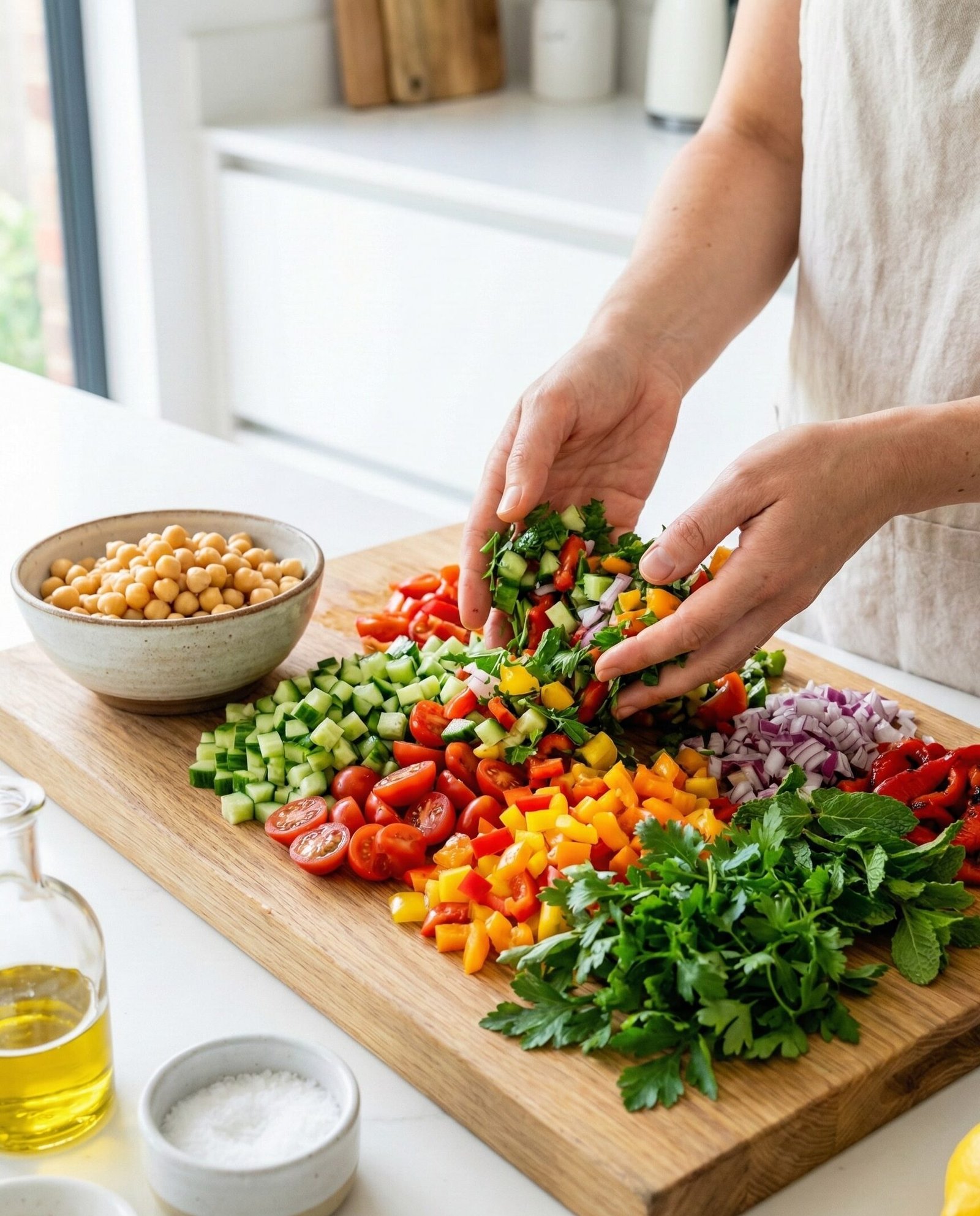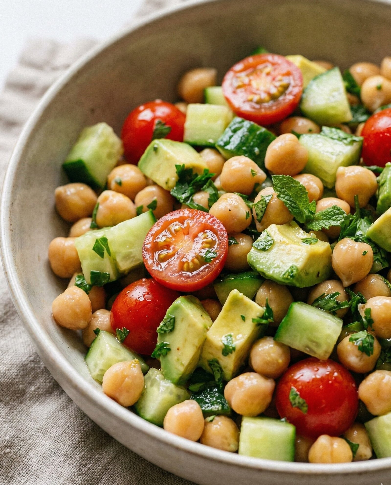 It’s the salad for people who say they don’t like salads. No limp lettuce, no boring bites—just a vibrant mix of fresh vegetables, herbs, chickpeas, and a tangy homemade dressing that wakes up your taste buds.