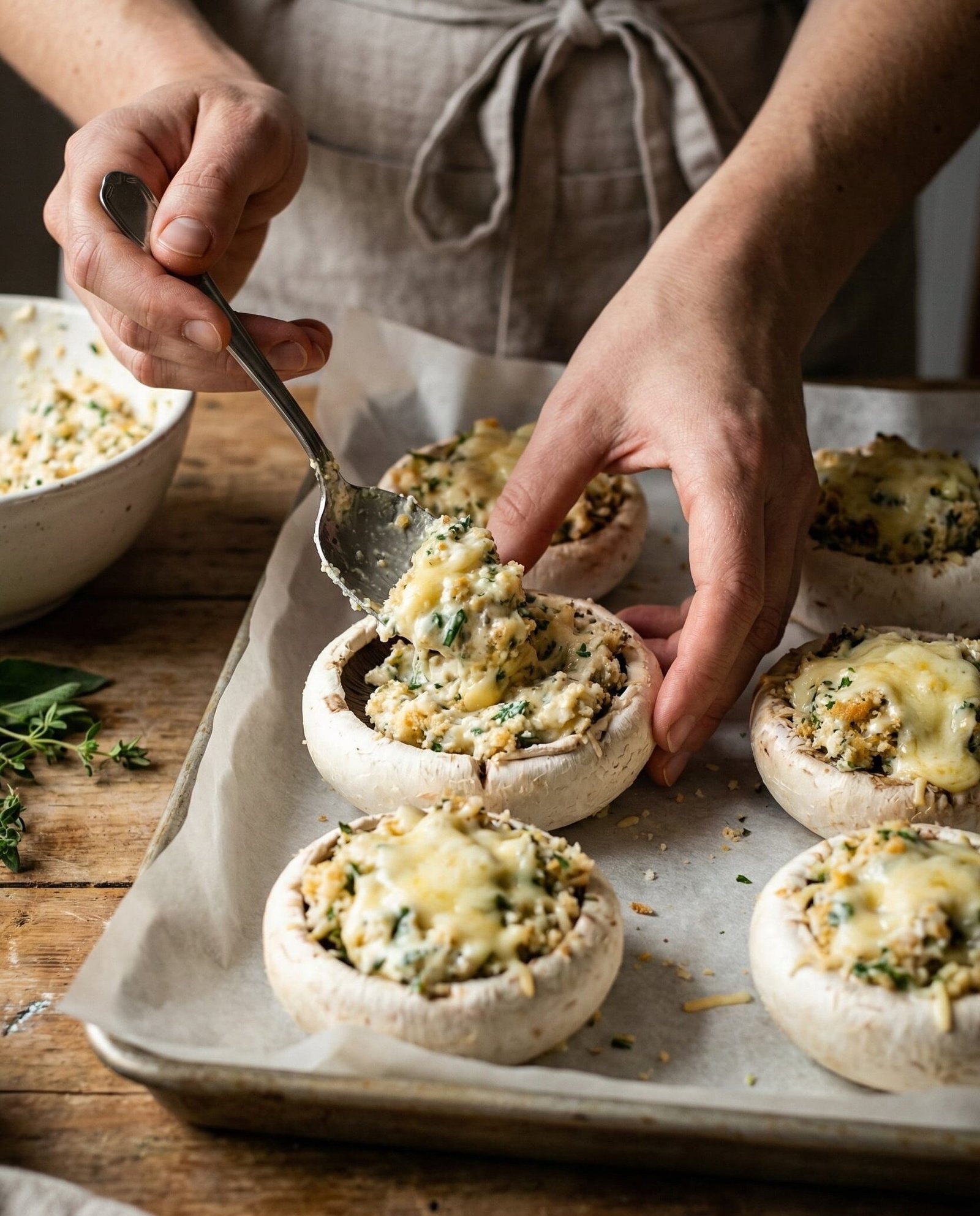 Stuff the mushrooms: Spoon the filling generously into each cap. I always overstuff—more is more when it comes to cheese.